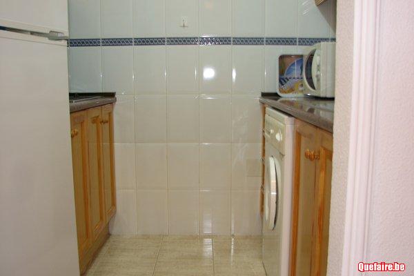 Une cuisine semi équipée avec cuisinière vitrocéramique, grille-pain, percolateur, frigo avec freezer, lave linge, bouilloire électrique, fer à repasser + planche.