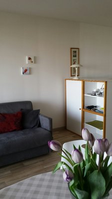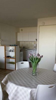 La partie jour, face mer, est composée d’une cuisine us équipée (lave vaisselle, lave linge, four et micro-ondes, frigo, 4 plaques et toute vaisselle suffisante pour 4 personnes) donnant sur le séjour avec canapé lit "rapido" convertible en 140, fauteuil, coin repas, tv écran plat. Le séjour ouvre sur le balcon face mer (table, chaises et transats à disposition).