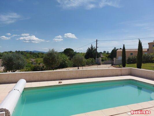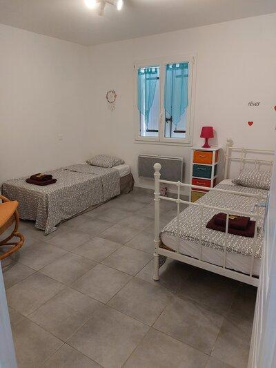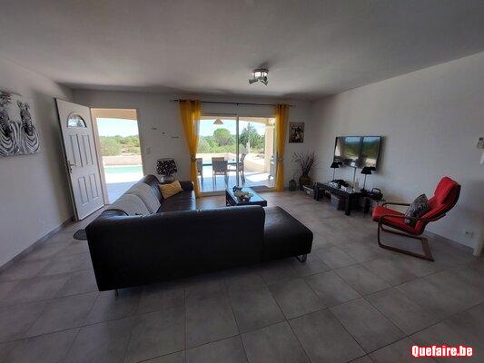 Maison privée dans le Gard climatisée de 150 m² avec 3 chambres : 1 chambre avec lit 2 personnes king size, 2 chambres avec 2x1 lit 90x 180 et 2 salles de bain : 1 sdb avec douche et double vasque et 1 sdb avec douche italienne, baignoire, double vasque et wc, 1 wc séparé, grande pièce à vivre avec cuisine ouverte et vue sur la terrasse. Piscine chauffée de mai à septembre(4x8m), terrain de boules, terrain de volley, baby foot, jeux fléchettes, jeux divers dans espace couvert. Terrain entièrement clôturé. Garage fermé pour une voiture (5x3 m).